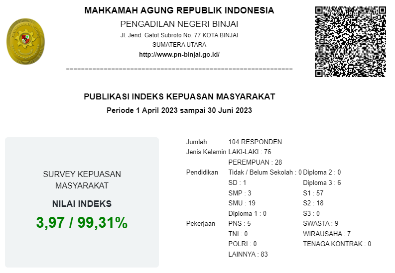 Ketua Pengadilan Negeri Binjai telah menetapkan Surat Keputusan meliputi daftar panjar biaya perkara, biaya radius untuk pemanggilan / pemberitahuan serta biaya proses dalam penyelesaian perkara perdata di Pengadilan Negeri Binjai
