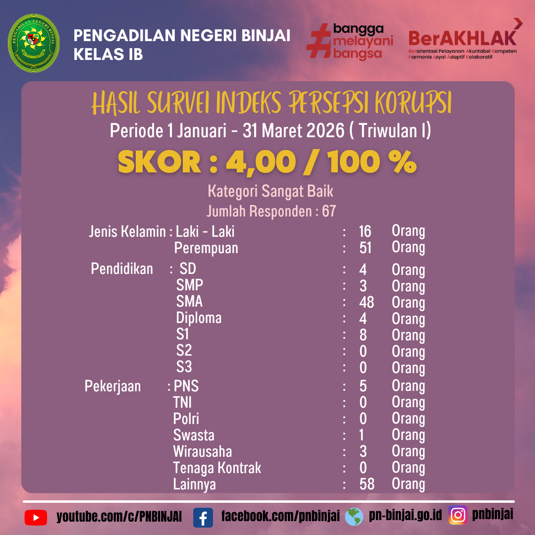 Ketua Pengadilan Negeri Binjai telah menetapkan Surat Keputusan meliputi daftar panjar biaya perkara, biaya radius untuk pemanggilan / pemberitahuan serta biaya proses dalam penyelesaian perkara perdata di Pengadilan Negeri Binjai