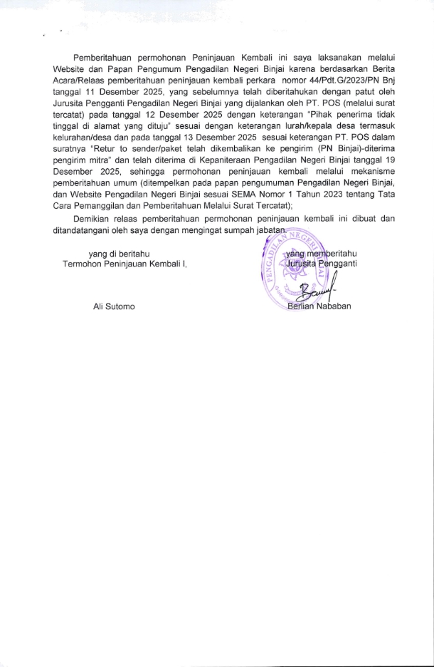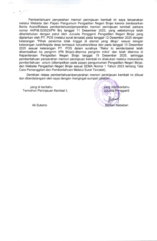 09 Januari 2026 RELAS PENYERAHAN MEMORI PENINJAUAN KEMBALI KEPADA TERMOHON PENINJAUAN KEMBALI Nomor: 44/Pdt.G/2023/PN Bnj, jo. Nomor: 420/Pdt/2024/PT MDN, jo. Nomor: 814 K/PDT/2025/ jo. Nomor: 3/Pdt. PK/2025/PN Bnj on Jumat, 09 Januari 2026. Posted in Relaas Panggilan Continue Reading