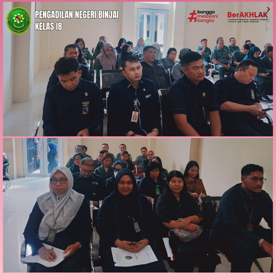 Binjai, 30 September 2025 Kegiatan Rapat Bulanan Pengadilan Negeri Binjai yang dipimpin oleh Ketua Pengadilan Negeri Binjai Bapak Bakhtiar, S.H., M.H. diikuti oleh seluruh Hakim, Pejabat Struktural dan seluruh aparatur serta PPPK Pengadilan Negeri Binjai. Ketua Pengadilan Negeri Binjai mengingatkan kepada seluruh keluarga besar Pengadilan Negeri Binjai agar menjaga akuntabilitas, kredibilitas dan integritas dalam melaksanakan tugas dan agar disiplin dalam menerapkan SOP sesuai dengan ketentuan yang berlaku sehingga dapat terhindar dari hal-hal yang dapat mencederai citra dan wibawa Pengadilan dan Ketua Pengadilan Negeri Binjai mengingatkan kembali tentang Peraturan Mahkamah Agung Nomor 7,8,9 Tahun 2016.